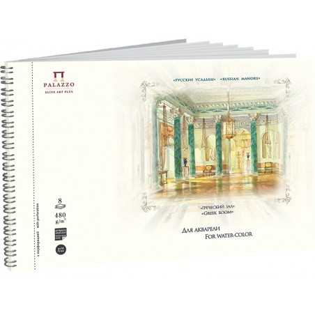 Blok do akwareli na spirali PALAZZO Elite Art "Grecki salon" z serii "Rosyjskie dwory" z papieru klasy premium o naturalnie białym kolorze. Blok został wykonany z wysokiej jakości bezkwasowego papieru o gramaturze 480g/m2. Format 163x250, 8 arkuszy.
